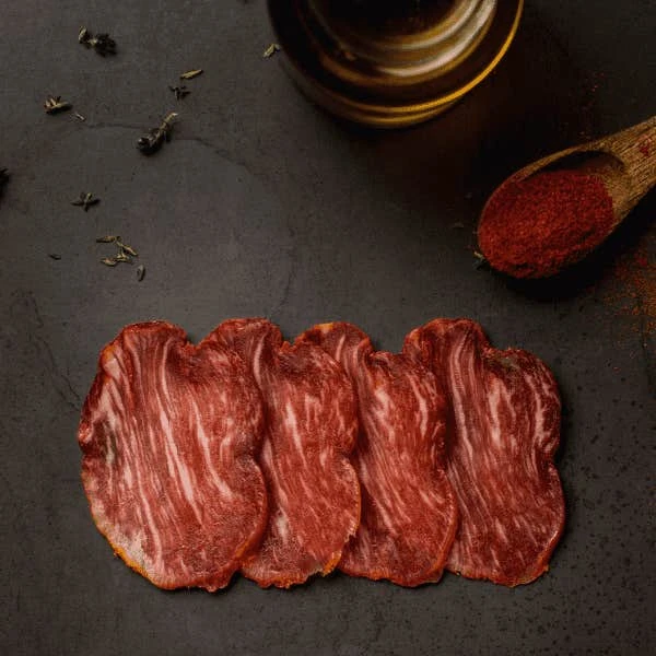 Lomito is a richer, squat version of one of the most famous sausages in Spanish pork butchery, namely lomo. It is still the pork tenderloin to which salt, paprika and other spices are added, after which it is stuffed into natural casings and cured three or four months in special drying rooms. The outside surface is light red, the inside is bright red and has the typical veins when cut. The Admiracion line is a selection of the best Blázquez patanegras.
