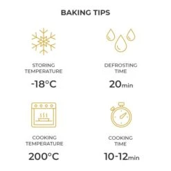 Directions for use: cooking temperature 200°C; cooking time 18-20 min, thawing time 20 min