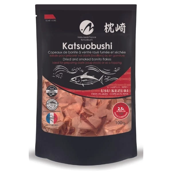 Katsuobushi is 100% natural, long-life smoked and heat-dried tuna. It all starts in Concarneau, France, where skipjack tuna stored at -20°C are thawed and then cut, cooked, smoked and heat-dried, cured and finally flaked. Production lasts from 1 to 3 months.