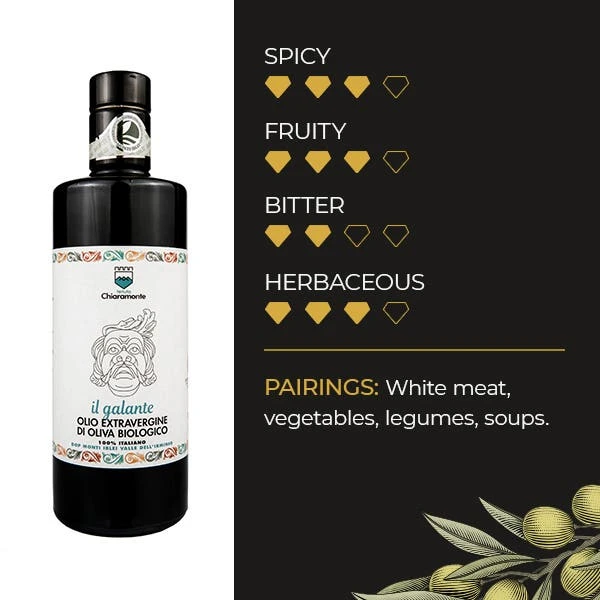 Tenuta Chiaramonte’s Galante is distinguished by its medium fruity odor with herbaceous sensation and green color; bitter and spicy notes are perceived on the palate, with a descriptor traceable to artichoke.