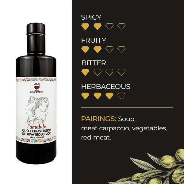 Tenuta Chiaramonte’s organic extra virgin oil L’Amabile is a blend dedicated to the most delicate palates, it has a green color tending to yellow, the perceptions are of a light fruitiness with slight notes of bitterness and spiciness.