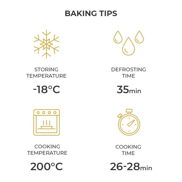 Directions for use: cooking temperature: 200°C; cooking time: 26-28 min; defrosting time: 35 min